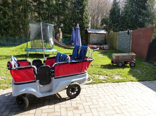 Der Garten, in dem es eine Rutsche, einen Sandkasten und die Möglichkeit zum Bobbycar fahren gibt, ist kindersicher eingezäunt.